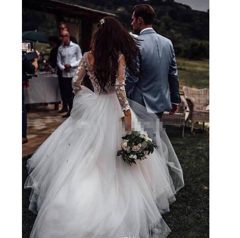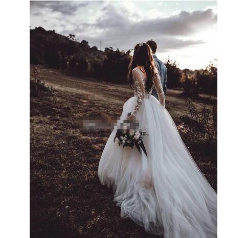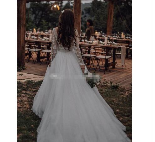 Boho Wedding Dresses Long Sleeves Appliques Tulle 2019 Wedding Gowns Slash Neck Garden Bridal Dresses Sweep Train
