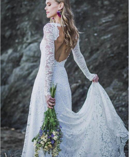 Boho Wedding Dresses Long Sleeves Lace Keyhole Back Wedding Gowns Scoop Garden Bridal Dresses Sweep Train