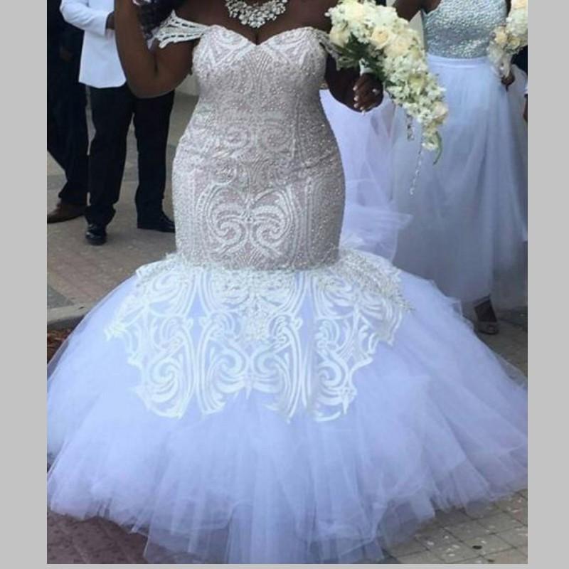 African Plus Size Wedding Dresses Major Beads Sequins Lace Appliques Mermaid Wedding Dress Off The Shoulder Tulle Lace Up Back Bridal Gowns