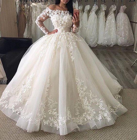 Long Sleeve Ball Gown Wedding Dresses New Floor Length Lace Applique Ruffle Pleats Bridal Dress Wedding Gowns