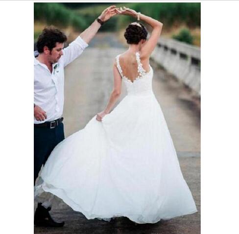Spaghetti Strap A Line Country Wedding Dresses Lace Appliques Ruched Chiffon Sweep Train Backless Garden Bridal Gowns