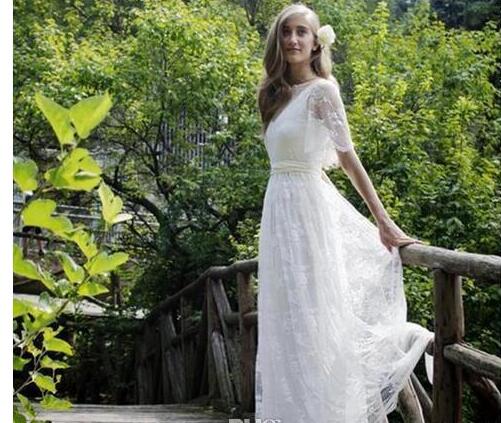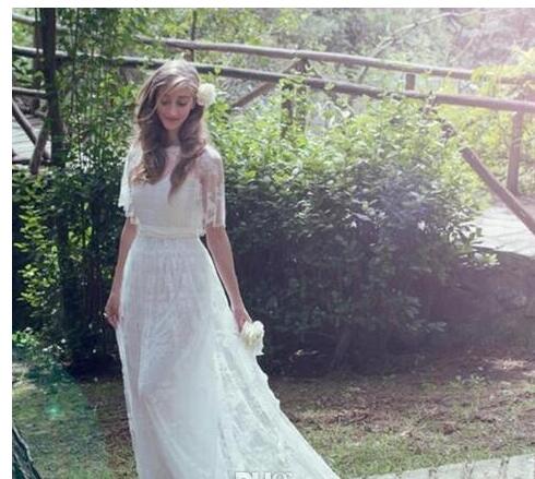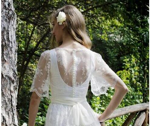 Country Style A Line Scoop White Lace Wedding Dresses Floor Length Lace Short Sleeve Sheer Back Formal Bridal Wedding Gowns
