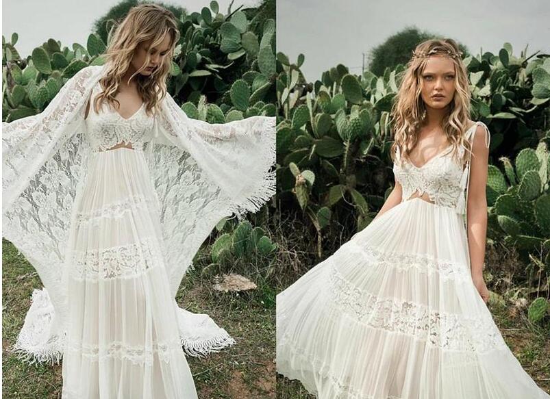 Bohemian Country Wedding Dresses with Long Lace Cape Wrap Spaghetti Backless Summer Holiday Beach Bridal Informal Wedding Gown