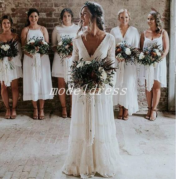Bohemian Wedding Dresses V Neck Long Sleeve Lace Sweep Train Beach Boho Garden Country Bridal Gowns