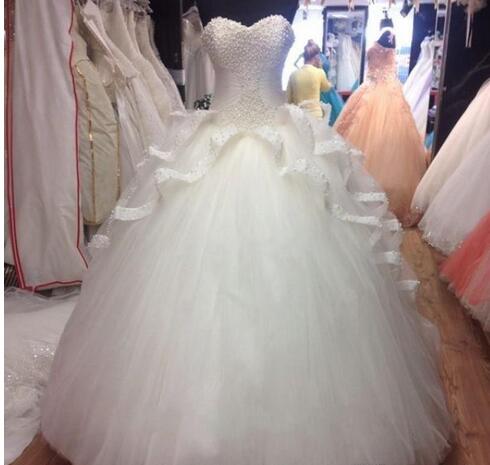 Modern White Pearls Ball Gown Wedding Dresses 2020 Ivory Cascading Ruffles Bridal Gowns Strapless Plus Size Arabic Wedding Dres