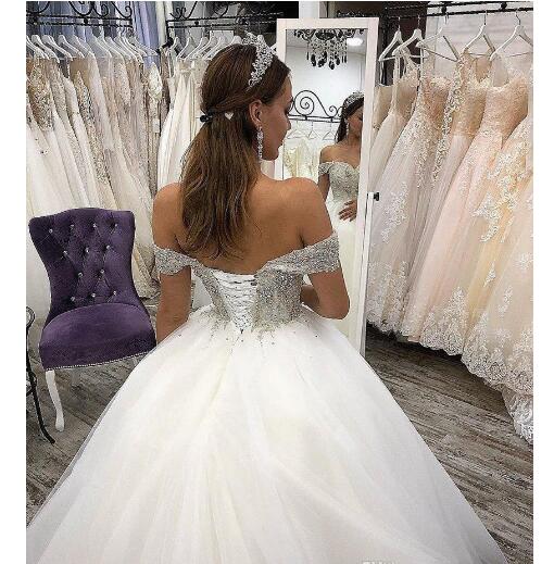 New Sexy White Off Shoulder A-Line Wedding Dresses Beaded Pearls Lace Up Back Chapel Train Bridal Gowns Robe De Mariee Customized