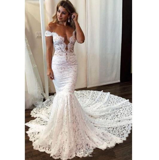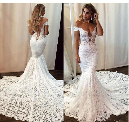 Full Lace Mermaid Wedding Dresses Elegant Off Shoulder Backless With Button Covered Long Bridal Gowns