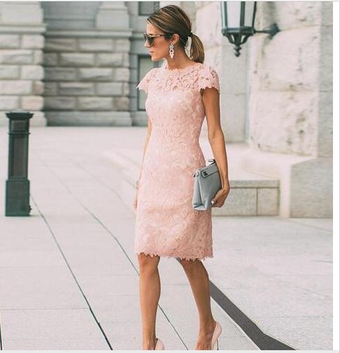 Blush Pink Full Lace Mother Of The Bride Dresses Plus Size Wedding Guest Dress Sheath Knee Length Mothers Outfits Casual Wear