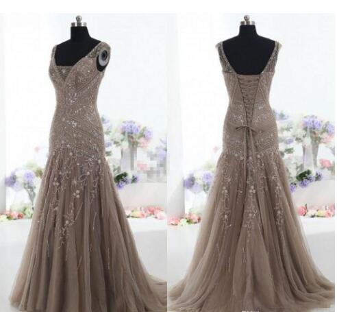 Brown Tulle Vintage Mother of the Bride Dresses Mermaid V Neck Applique Beads Tulle Corset Custom Made Mother Formal Evening Gowns