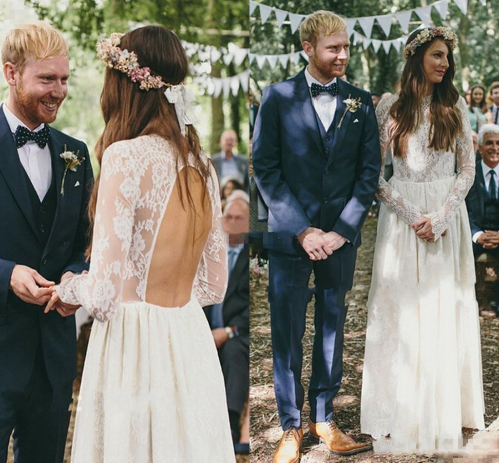 Country Bohemia Backless Wedding Dresses with Long Sleeve A-Line Floor Length Chiffon Jewel Western Country Wedding Full Lace Bridal Gown