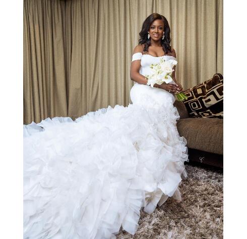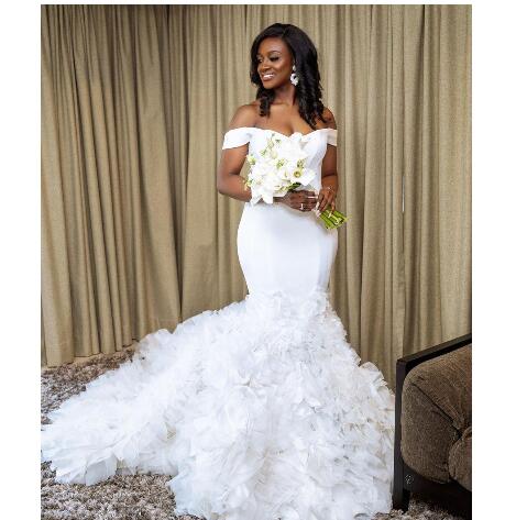 Cascading Ruffles White Mermaid Wedding Dresses Off Shoulder Backless Sweep Train Chapel Garden Bridal Gowns