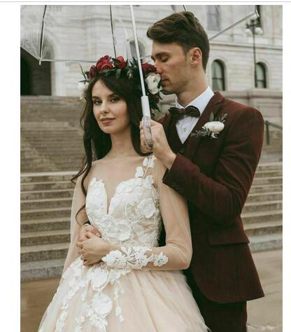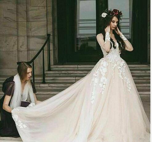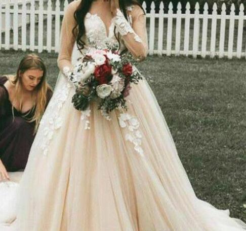 Nude Tulle White Lace Wedding Dress Illusion Long Sleeve Sheer Neck Light Champagne Romantic Garden Bridal Gowns