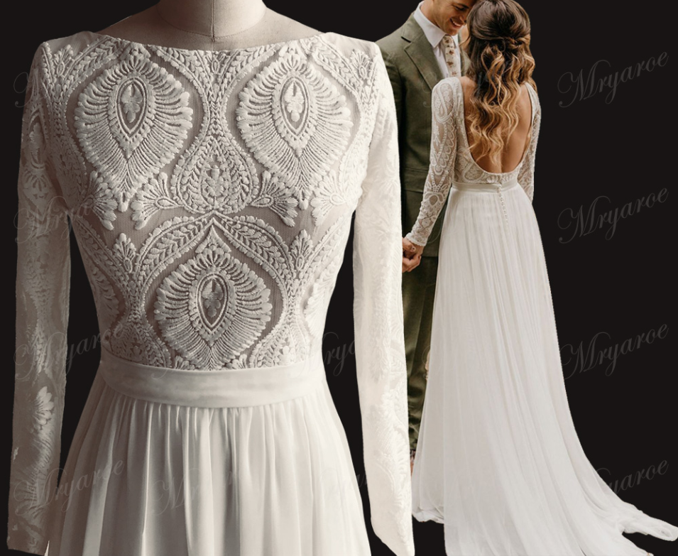 Lace Long Sleeves Open Back Hippie Style Wedding Dress Chiffon Detachable Train Boho Chic Rustic Bridal Gowns