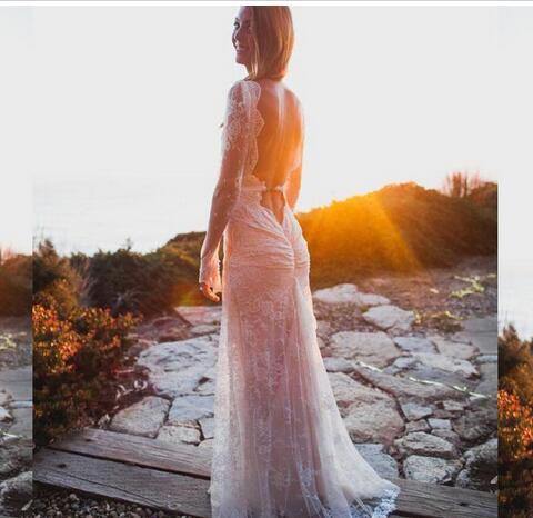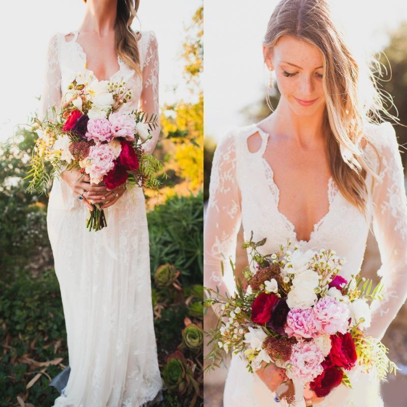 Country Spring Bohemian Wedding Dresses With Long Sleeves Plunging Neck Sexy Open Back Lace Beach Boho Bridal Party Gowns