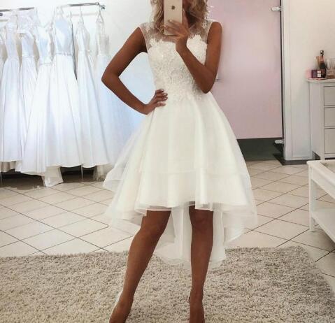 High Low Short Wedding Dresses Sleeveless Jewel Neck Beads Sequins Appliques Lace Short Front Long Back Bridal Gowns