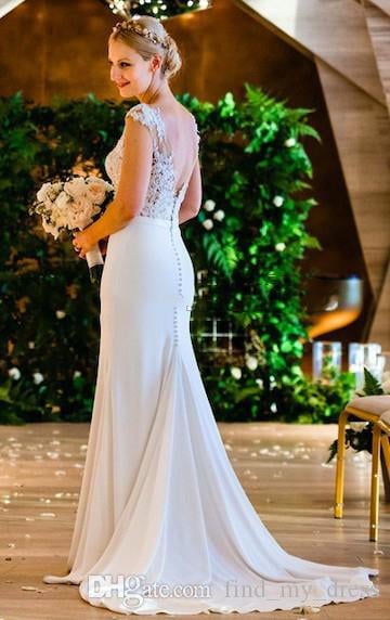 Sheer Neck Mermaid Wedding Dresses With Lace Appliques Cap Sleeves Open Back Satin Sweep Train Bridal Dress