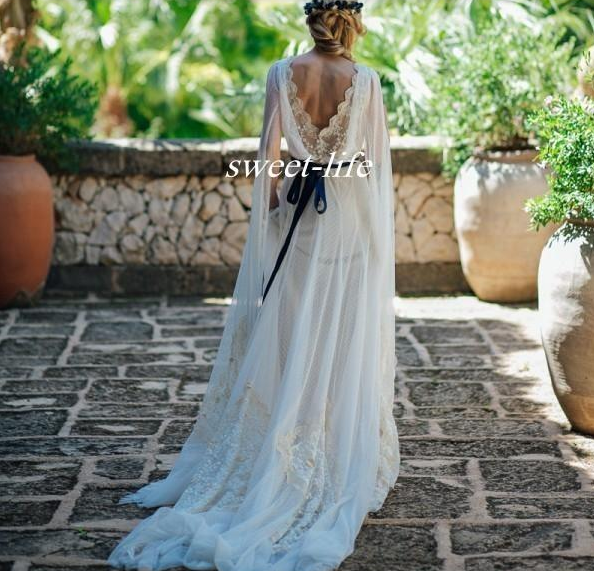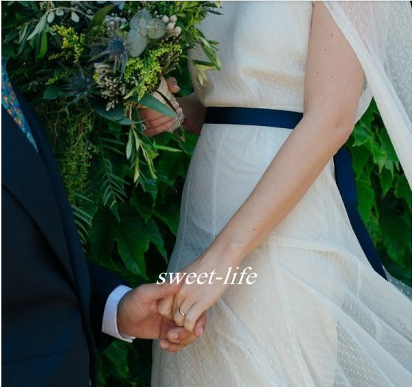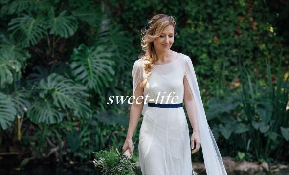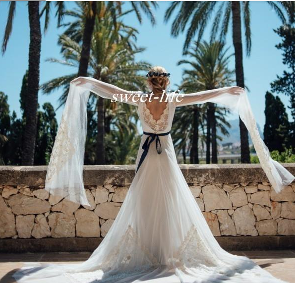 Bohemian Wedding Dresses Sheer Neck Flowing Ribbon Sleeves Lace Appliques Country Bridal Gowns with Navy Blue Sash