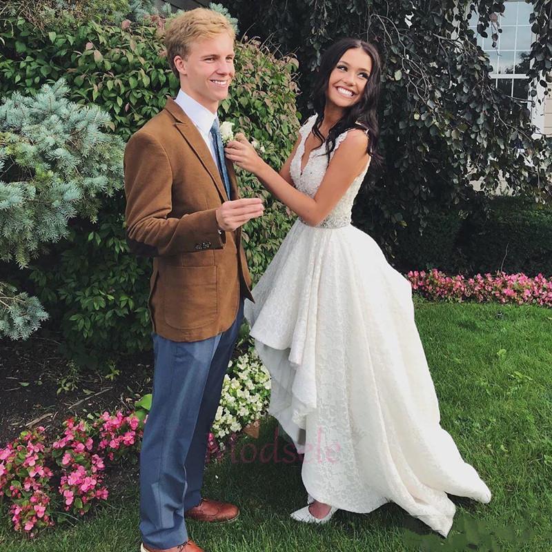 Hot Sale High Low Lace Country Wedding Dresses V Neck Sleeveless Vestidos De Novia Bride Party Formal Gowns