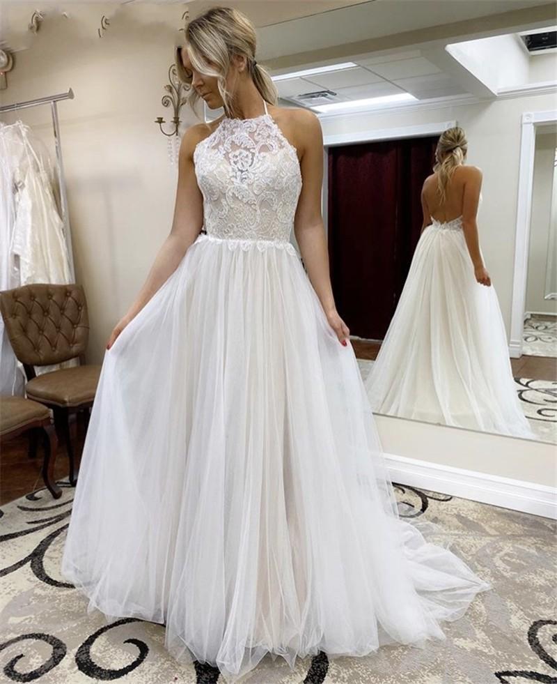 Modest Lace Wedding Dresses Halter Illusion Backless A-Line Sweep Train Beach Boho Bridal Gowns Customized