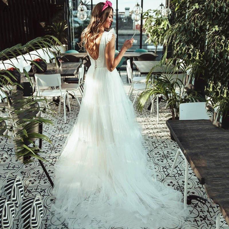 Soft Tulle Wedding Dresses Deep V Neck Sexy Open Back Vestidos De Novia A Line Bride Gowns