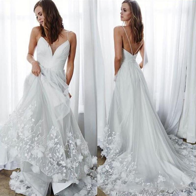 Spaghetti Straps Wedding Dresses Appliques Lace Sexy Deep V-Neck Long Dress Sweep Train Bridal Gowns Robe De Mariee