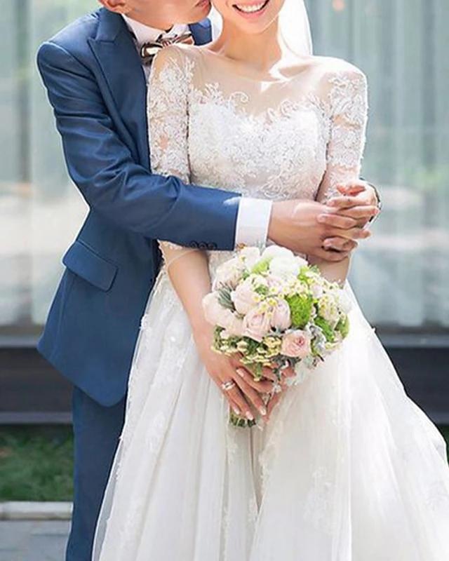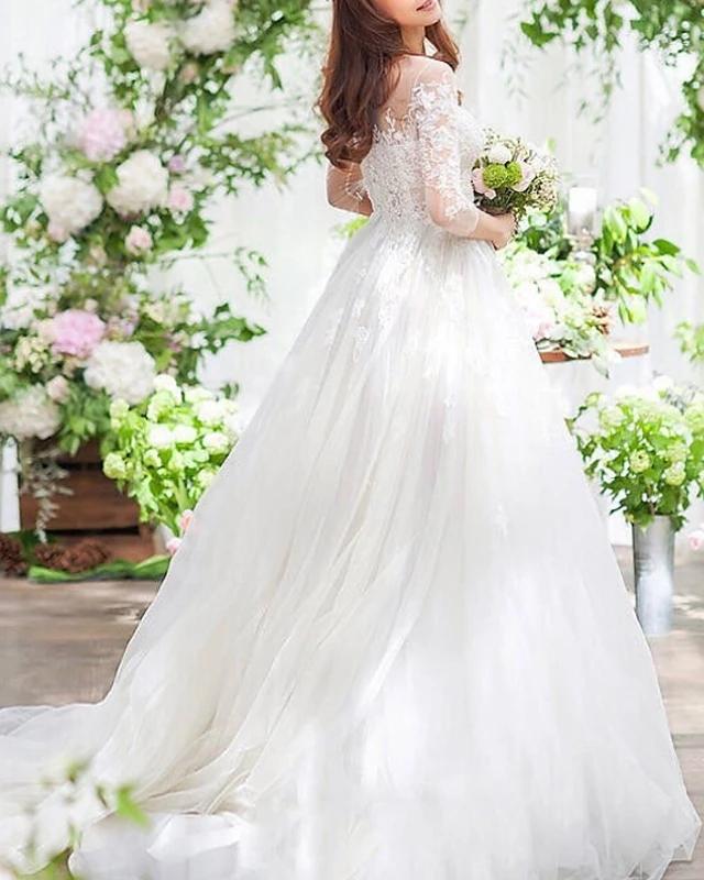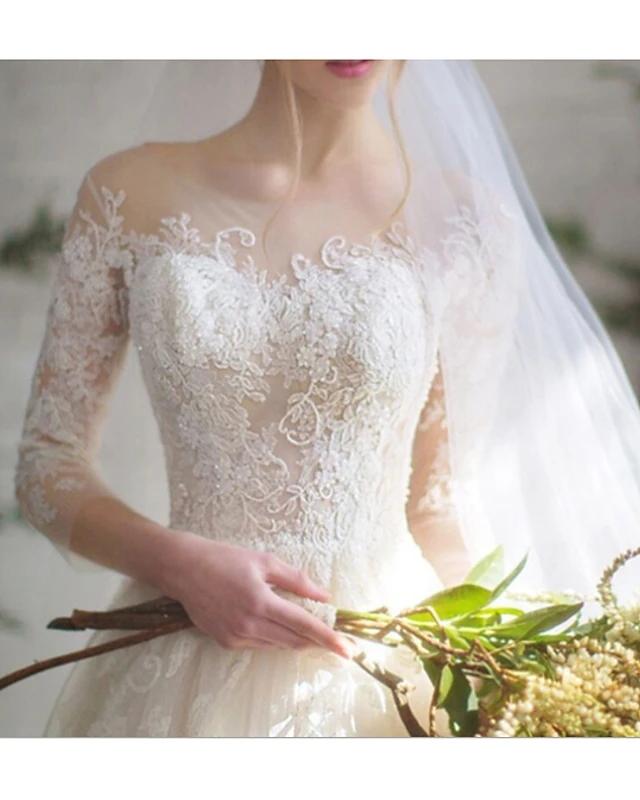 A-Line Wedding Dresses Off Shoulder Sweep / Brush Train Lace 3/4 Length Sleeve Country Romantic See-Through Illusion Detail with Beading
