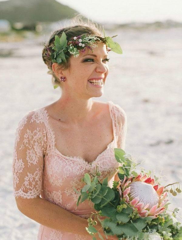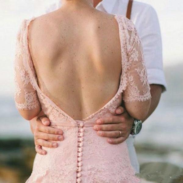 Elegant Pink A Line Wedding Dresses Short Sleeve Lace Boho Beach Bridal Gowns Garden Sexy Backless Sweep Train Robes De Mariee