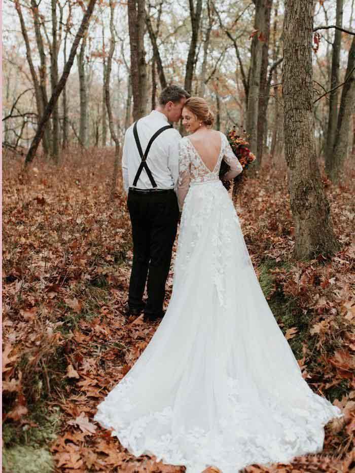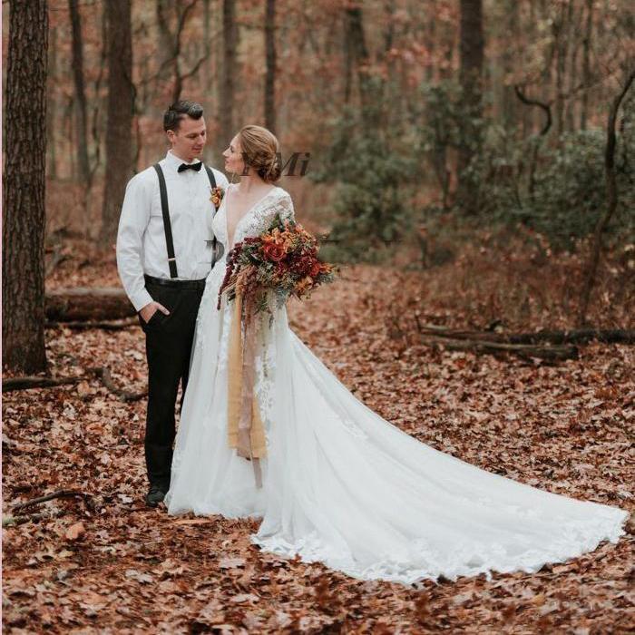 Sexy V Neck Backless A Line Country Wedding DressLong Sleeves See Through Appliques Lace Garden Bridal Gowns