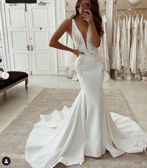 Elegant Mermaid Sexy Deep V Neck Wedding Dresses Appliques Lace Bridal Gowns