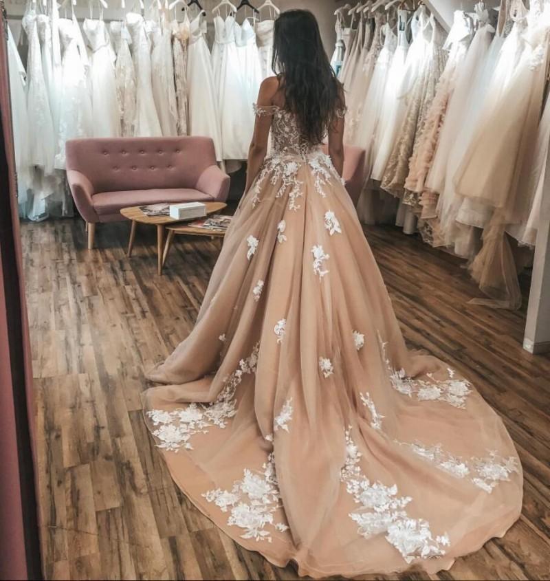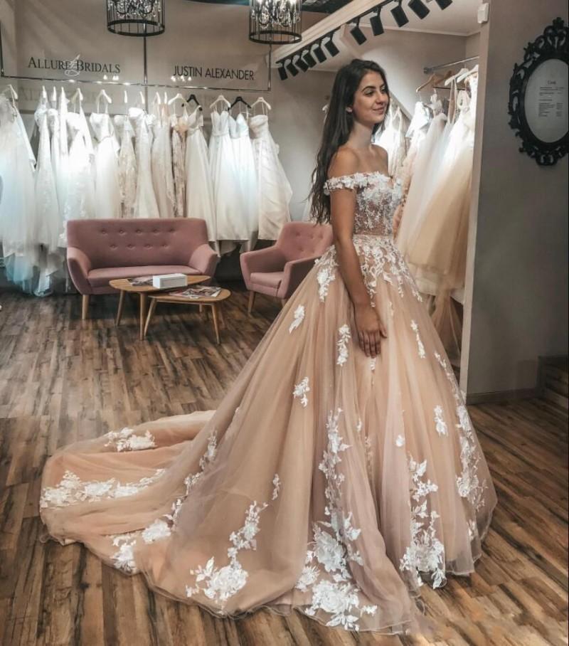 Sexy A Line Chamgane Wedding Dresses Lace Applique Off the Shoulder Lace-up Back Bridal Gowns Court Train robes de mariée