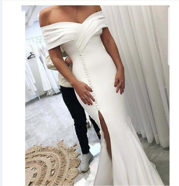 Spandex Wedding Dresses Mermaid Off the Shoulder Short Sleeve Buttons Side High Split Modern Bridal Gowns Custom Made Plus Size