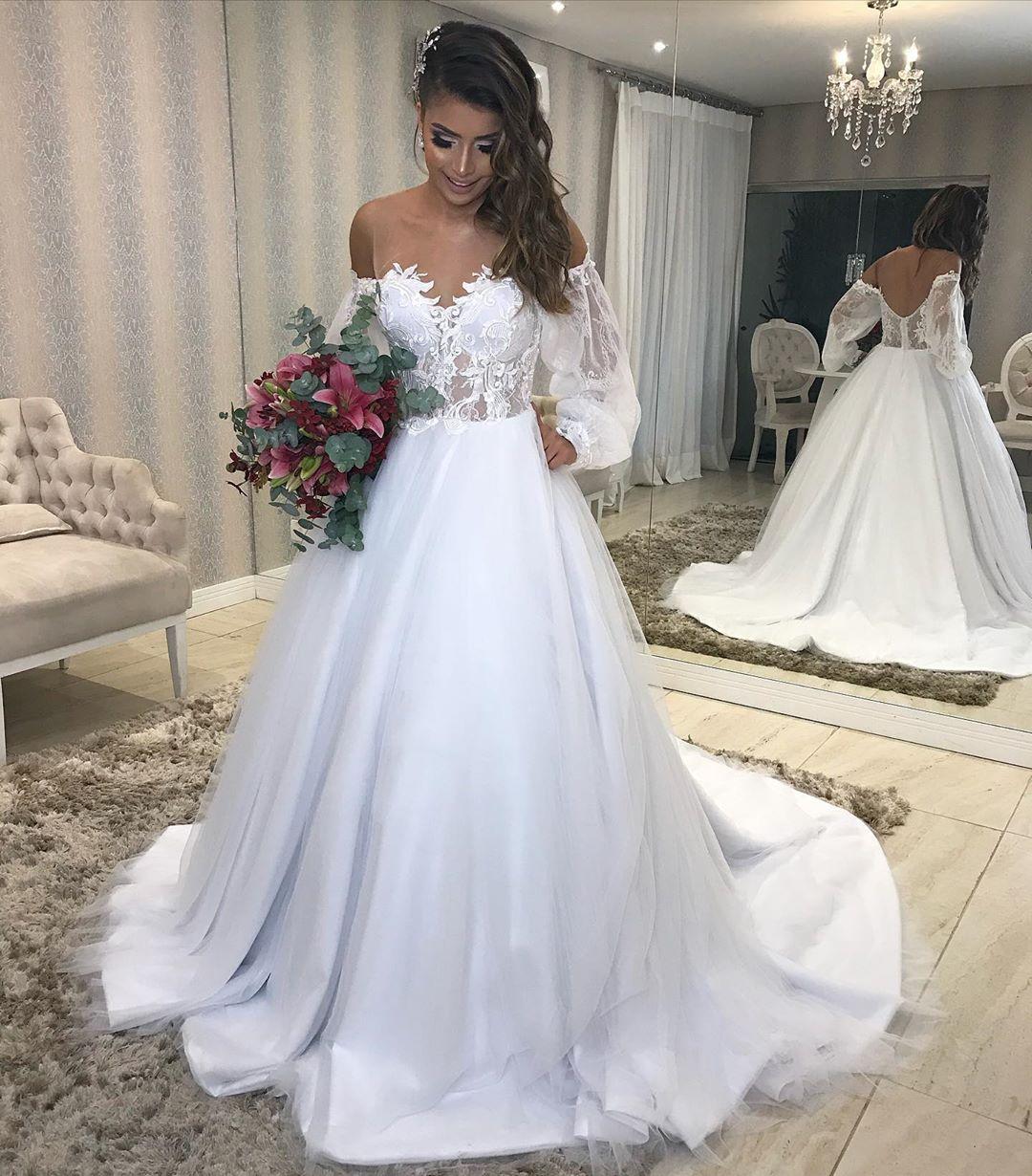 Stylish A Line Lace Backless Wedding Dresses Sheer Bateau Neck Long Sleeves Bridal Gowns Sweep Train Tulle robe de mariée