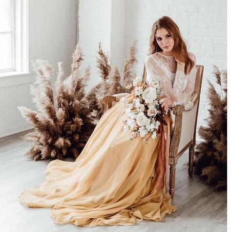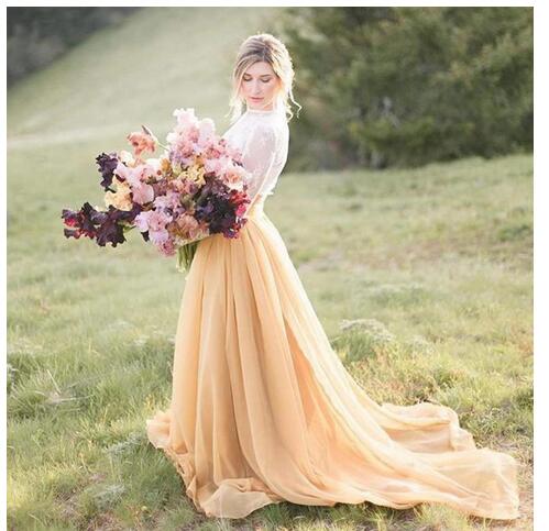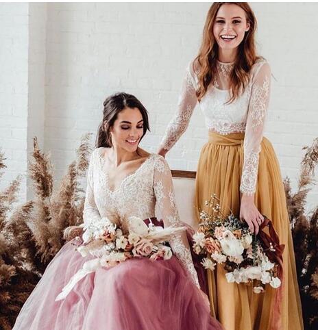 Country Boho Two Piece Wedding Dresses A Line Tulle Skirt Sweep Train Country Bridal Gowns Lace Long Sleeve Robes De Mariee