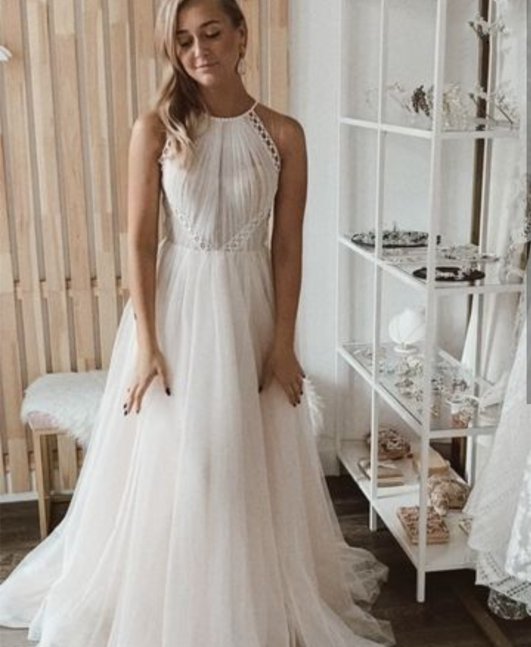 Halter Wedding Dress Boho Sleeveless Tulle A-Line Robe De Mariee For Women Bridal Gowns Court Train White Pleat Lace Appliques