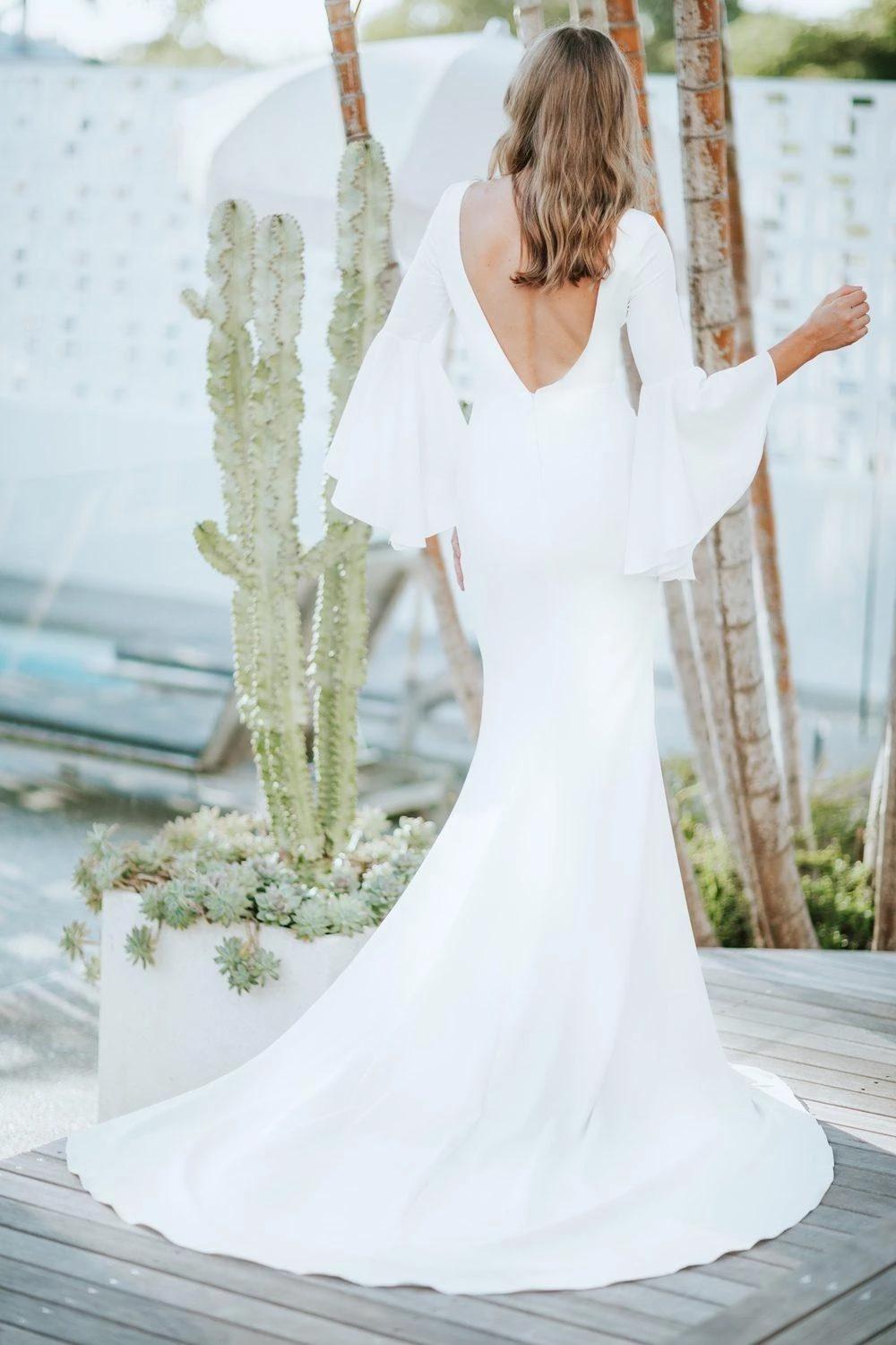 Simple Juliet Long Sleeves Memaid Wedding Dress 2022 V Backless Satin Ruched Applique Arabic Country Designer African Court Train Bridal Gowns