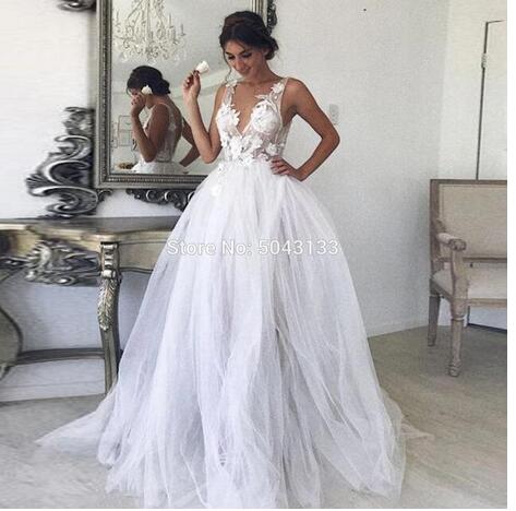 Unique Tulle Appliques Flowers Wedding Dresses V Neck Sleeveless Vestido De Noiva Sexy Backless Floor Length Lace Bridal Gowns