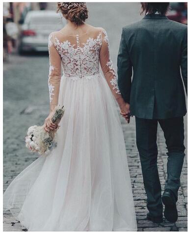 Simple Tulle Lace Applique Wedding Dresses 3/4 Long Sleeve Scalloped Floor-Length A-Line Bridal Dress Unique Covered Button