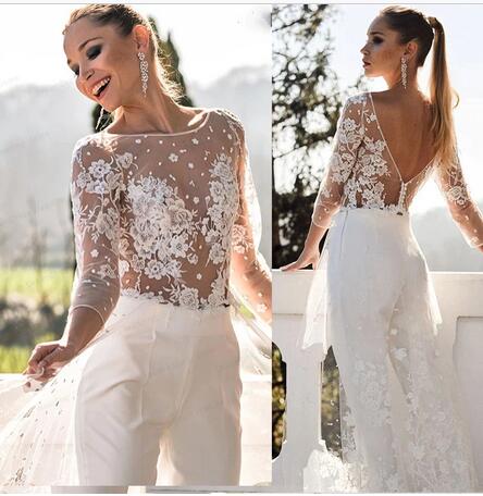Robe Chic Bridal Wedding Jumpsuit Tea Length Backless Sexy Women Receiption Party Gown with Lace Robe De Mariee Bridal