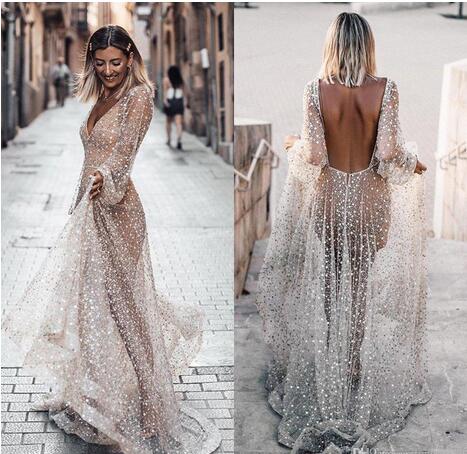 Newest Beach Backless Wedding Dresses V Neck Tulle A Line Boho Country Bridal Gowns Beaded Sequins Wedding Dress Robe De Mariee
