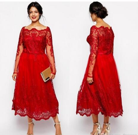 Vintage Red Mother off Bride Dresses Bateau Neck Lace Appliques Long Sleeves Plus Size Mother Of the Bride Gowns Wedding Guest Dress